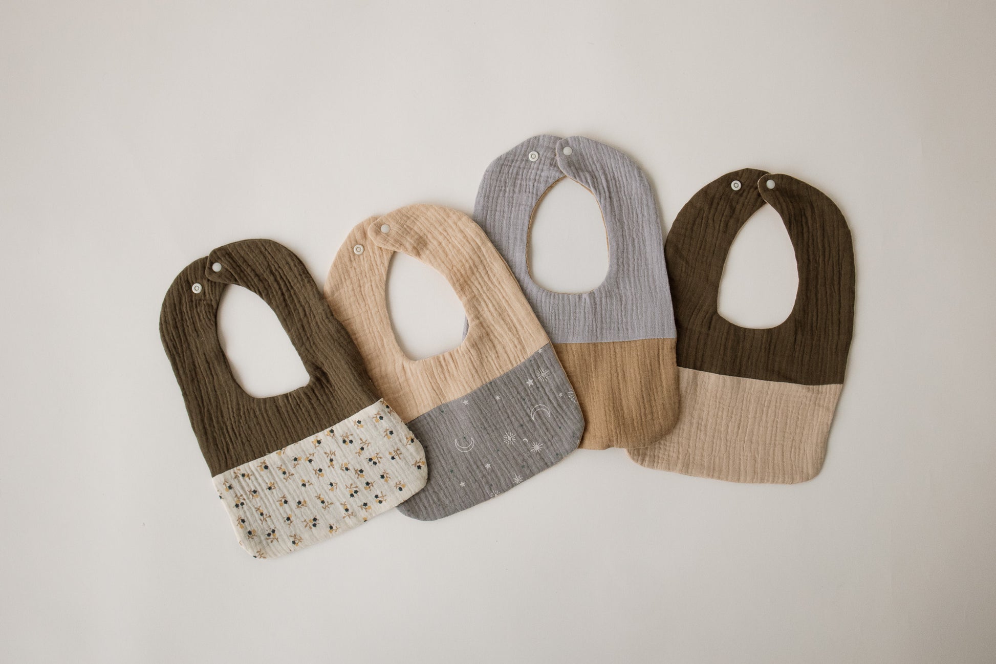 Keep your little one clean in style with these modern two-tone baby bibs, crafted from soft, breathable cotton muslin. Designed with a clean minimalist aesthetic and available in a variety of earthy and neutral color combinations, each bib features lightweight layers that are gentle on sensitive skin and absorbent enough for everyday use. With adjustable snap closures and an eco-conscious design, they’re a beautiful blend of function and simplicity — perfect for mealtime, drool days, or gifting.