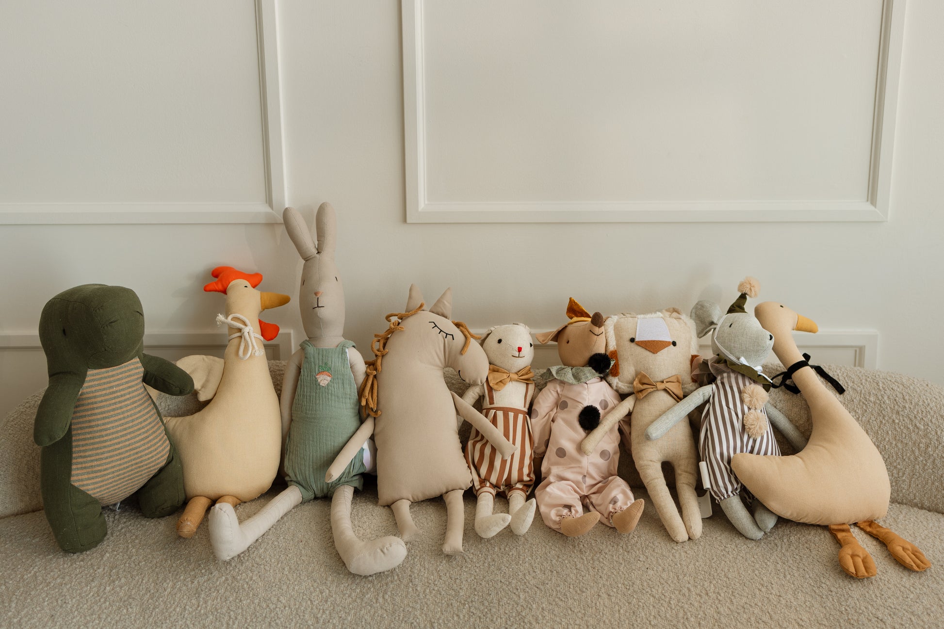 Meet Benny the Bunny — a charming cotton plush dressed to impress in his striped overalls and matching bow tie. With long floppy ears, a sweet red nose, and soft stitched details, Benny makes the perfect companion for cuddles, playtime, or nursery shelf styling. Lightweight, soft, and full of personality, he’s a timeless gift for little ones and a sweet touch for modern nurseries.